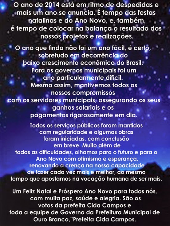 Prefeita Cida Campos: Esse tempo à frente do Governo de Ouro Branco, de um lado, foi um tempo de aprendizado, de conhecimento da máquina pública e da realidade administrativa, financeira e operacional, bem como da realidade dos serviços públicos em andamento. De outro lado, foi tempo de perceber e aprender a ação política de um modo mais profundo, pois, até então, eu tinha sido somente vereadora, sem oportunidade de exercer cargo de gestão. O ano que finda não foi um ano fácil, sobretudo em decorrência do baixo crescimento econômico do Brasil. Para os governos municipais foi um ano particularmente difícil e muitos prefeitos, mais de 1/3, não vão conseguir pagar a folha de pagamentos do mês de dezembro e o décimo terceiro salário.
